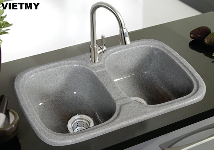 - Chậu rửa chén đá nhân tạo Việt Mỹ có thành phần chủ yếu từ khoáng đá tự nhiên và keo Acrylic, được sản xuất trên công nghệ hiện đại. Sản xuất nguyên bệ nhờ tính uốn cong của đá nhân tạo, không hàn, không mối nối, vừa đảm bảo tính thẩm mỹ, vừa đảm bảo độ an toàn, không rò rỉ nước.